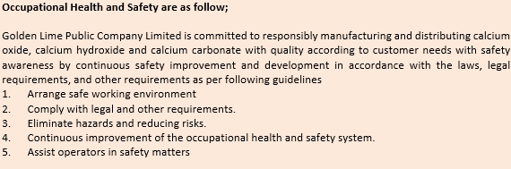 Golden Lime Public Company Limited (SUTHA) is committed to developing its business operations to be in line with the sustainable development framework and has applied guidelines in accordance with the sustainability assessment criteria of listed companies on the stock exchange and the policy framework according to the expectations of key stakeholder groups in order to Framework for guidelines for setting directions Development drives business sustainably with responsibility towards society, the environment and stakeholders. The " Policy Framework for Sustainable Development and Environmental and Social Responsibility_ESG Policy" and Social aspect is as follows.