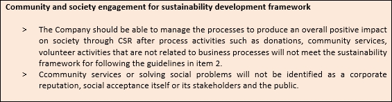 - Projects / Initiatives contribute to community development or solution through business processes by setting operating strategies with the community or jointly solving social problems as well as following up on results and benefits that the company receives in terms of quantity/value/economic returns such as income, profits, and expenses that can be reduced or a reduced level of risk or quantifiable social benefits/returns to the community or benefits to society in terms of process results (Output) or final results (Outcome)